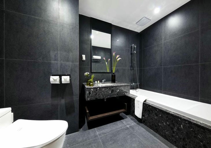 Добиваемся интересного эффекта, сочетая черный пол с черной стеной — черный как бы «перетекает» из одной плоскости в другую. Но будьте осторожны! Черный кафель не должен быть сплошным полотном. У потолка оставляем белую полосу — благодаря этому комната не будет зрительно давать усадку. Как описано выше, вы можете выделить определенные зоны в ванной комнате. Например, черные стены и пол выделяют пространство, где находится душевая кабина. С другой стороны ванной есть место для оформления в белом цвете — белая плитка, белая ванна или деревянный шкафчик с раковиной.