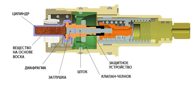 То есть малейшее изменение температуры приводит к изменению состояния внутреннего элемента, обычно это расширение, что влияет на положение друг относительно друга прочих деталей. Например, следствием изменения состояния является смещение клапана.