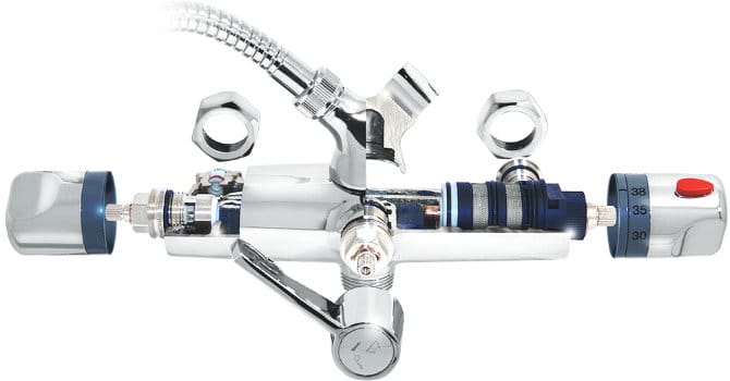Основной компонент термостатического смесителя — термостатический картридж — устройство, которое позволяет поддерживать постоянную температуру смешанного потока воды независимо от изменений давления в системе водоснабжения. Если изменяется соотношение горячей и холодной воды по какой-либо причине, термостатический картридж немедленно реагирует и обеспечивает на выходе заданную температуру водной струи.