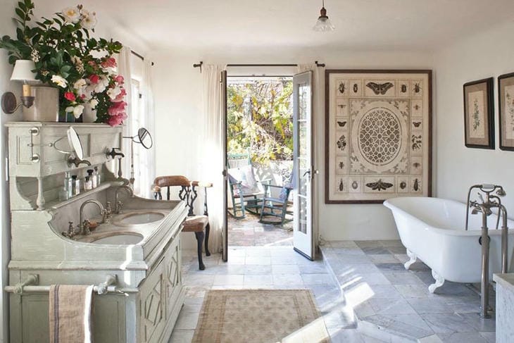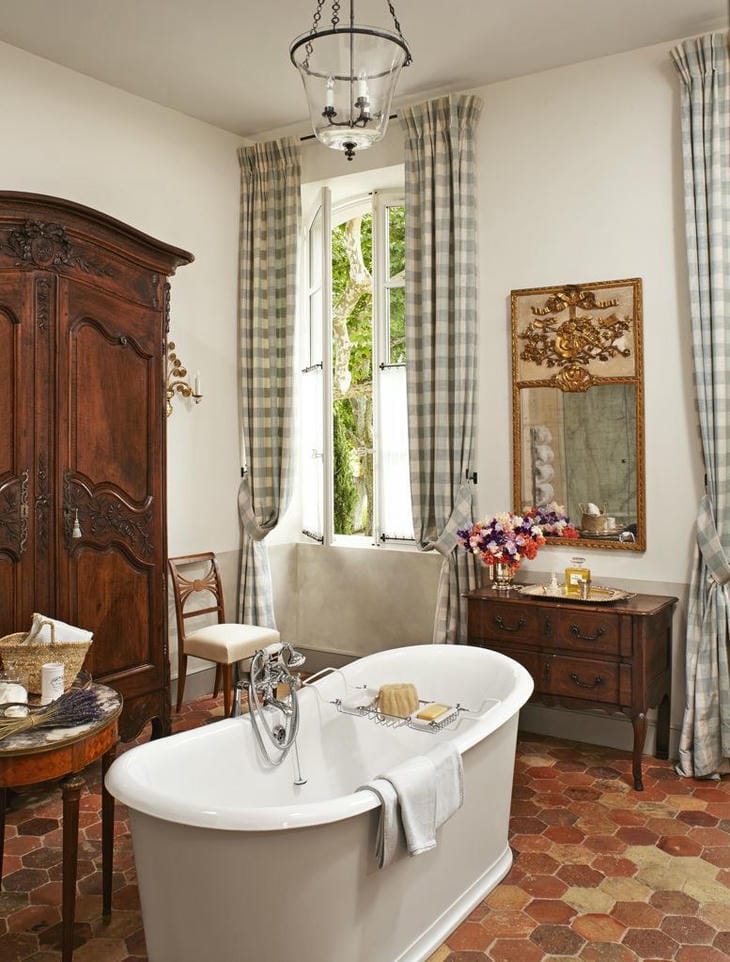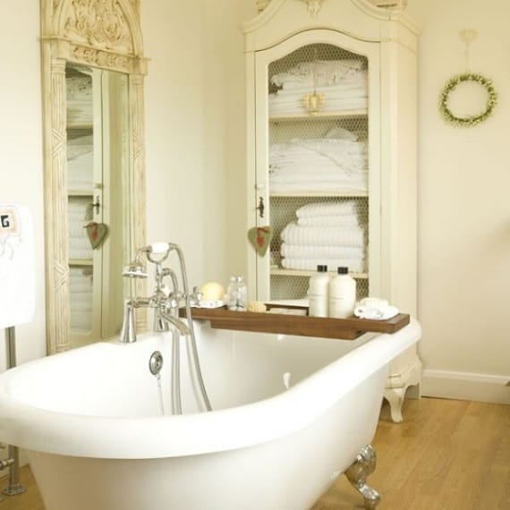 До недавнего времени отдельностоящие ванны (часто ставили двойные) в стиле ретро были непременным элементом оборудования ванных комнат в парижском стиле. Богато украшенные, стилизованные ножки придавали интерьеру роскошный характер и выдавали одухотворенность придворной моды. Сегодня все чаще во французских ванных комнатах прямо на пол ставят элегантные отдельно стоящие ванны. Иногда их даже заменяют душем (если внутреннее пространство ограничено и не дает возможности для удобного расположения ванны).