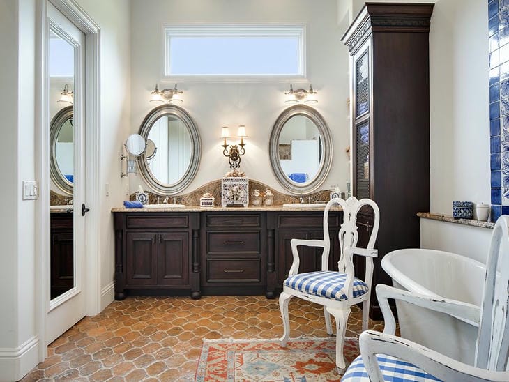 Другие элементы керамики для ванной комнаты (умывальники, унитазы, биде) обязательно должны сохранять классический, утонченный характер — они не могут быть эксцентричными и подавляющими. Также лучше всего, если они будут белыми, чтобы сохранить интерьер легким и свежим. Умывальники для французской ванной стоит устанавливать парами. Такая процедура повышает функциональность интерьера и подчеркивает симметрию, что особенно ценится в этом стиле.