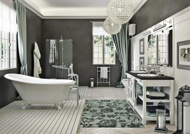 Для обретения простора вместо классической люстры лучше использовать тонкие белые точечные светильники, а вместо ванны выбрать душ. Лучше всего подходит для скрытого душа без поддона, ограниченного только стеклянными панелями, но доступна и классическая (например, угловая) модель. Остальное оборудование должно быть сведено к минимуму. Все, что вам нужно — это легкий комод на изогнутых ножках, с местом для косметики и полотенец, и стилизованное кресло, куда можно положить халат. На пол следует бросить яркий пушистый коврик – он сделает интерьер уютнее и согреет ноги после выхода из душа.