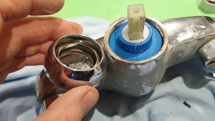 Если прикипел картридж смесителя, очиститель позволит убрать эффективно окислы, снять декоративную накладку и открутить винт, внутреннюю гайку, удерживающую картридж.