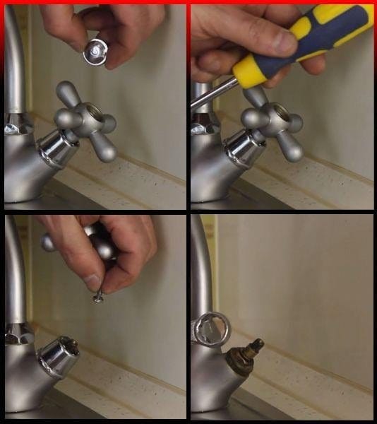 - Обычно вентили крепятся при помощи винтов или гаек. С помощью отвертки открутите винты, которые держат маховики. Снимите вентили со смесителя.