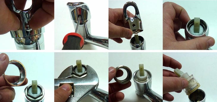 После снятия рукоятки, открутите гайку, которая держит картридж (механизм управления подачей горячей и холодной воды) в корпусе смесителя.